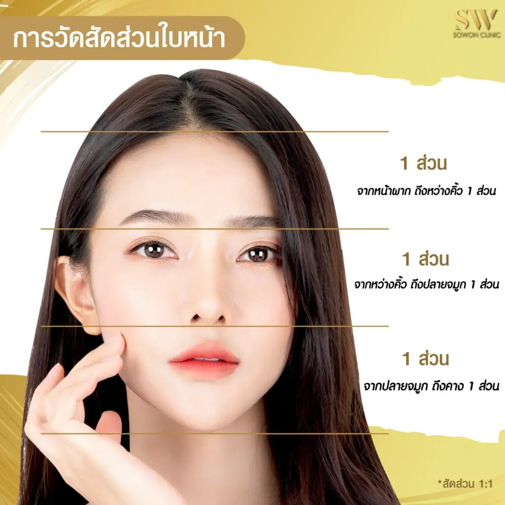 ก่อนที่เราจะตัดสินใจเลือก ฟิลเลอร์คาง เสริมคาง เราจะต้องประเมินรูปหน้าของตัวเองเสียก่อน จะได้รู้ว่าเราควรเหมาะกับอะไรกันแน่ค่ะ โดยสัดส่วนของใบหน้าที่สวยงามได้รูปจะต้องแบ่งสัดส่วนออกได้เป็น 1 : 1 : 1 ดังนี้ค่ะ