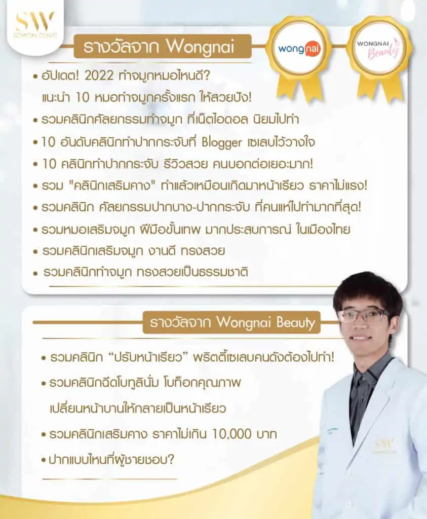 คลินิกเราได้รับรางวัลจากสื่อชั้นนำต่าง ๆ มากมาย โดยรางวัลด้านศัลยกรรมก็มีหลากหลายรางวัลชั้นนำของสื่อชื่อดังอย่าง Wongnai เว็บไซต์รีวิวชื่อดัง ทาง Sowon Clinic ก็ได้รับรางวัล ทั้งเรื่องความนิยม ทรงสวย จนไปถึงรางวัลที่การันตีหมอว่าทางคลินิกเรา มีเทคนิคและฝีมือที่น่าเชื่อถือ และได้รับการไว้วางใจจากคนไทยทั้งประเทศ