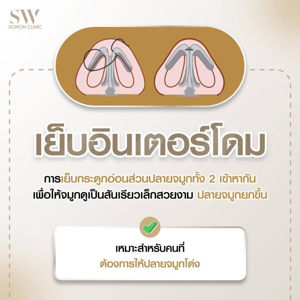 การเย็บอินเตอร์โดม นอกจากจะช่วยให้จมูกดูพุ่งแล้ว เทคนิคนี้จะช่วยให้ลดการทะลุของ ซิลิโคน ในอนาคตด้วยนะคะ คุณหมอที่โซวอนของเราก็จะใช้เทคนิคเสริมจมูกแบบกึ่งเปิดนี่แหละค่ะ ในการเย็บอินเตอร์โดม คุณหมอของเราจะทำการเปิดแผลในรูจมูกทั้ง 2 ข้างนะคะ แล้วก็ทำการเย็บกระดูกอ่อนตรงปลายจมูกให้เข้าหากันมากขึ้น เหมาะมากเลยกับคนไข้ที่ปลายจมูกไม่เชิด ปลายจมูกกลม อยาก เสริมจมูกแบบไหนดี ก็ปรึกษากับคุณหมอได้เลย